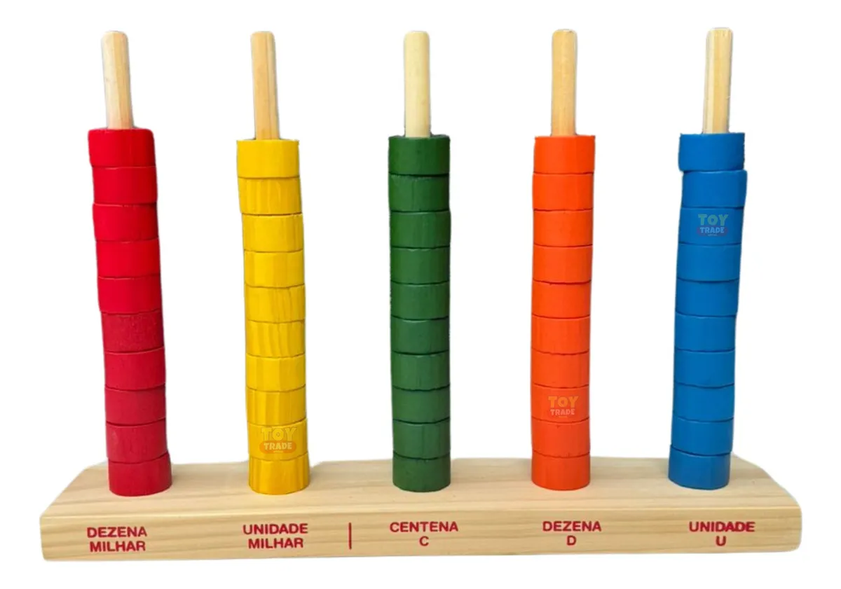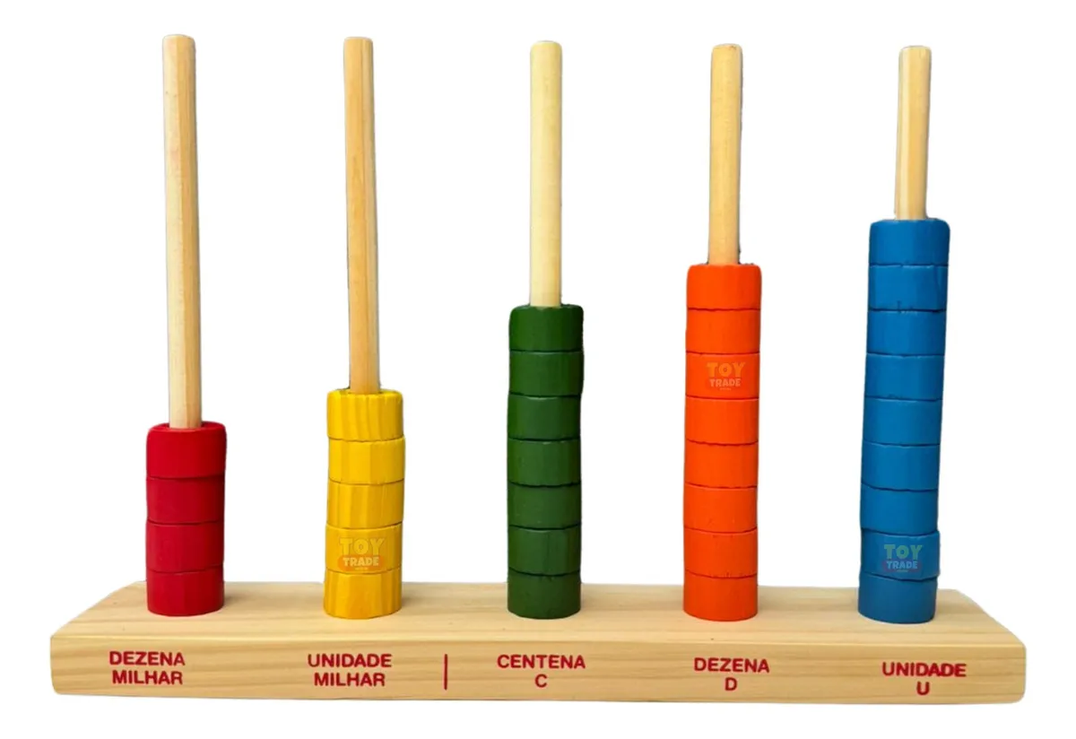 O Ábaco Aberto Toy Trade é um material pedagógico completo, confeccionado em madeira de reflorestamento com acabamento resistente e detalhes educativos. Possui 5 colunas com marcações numéricas (Unidade, Dezena, Centena, Unidade de Milhar e Dezena de Milhar), e vem com 50 argolas coloridas, proporcionando um ensino prático e visual dos conceitos matemáticos fundamentais.