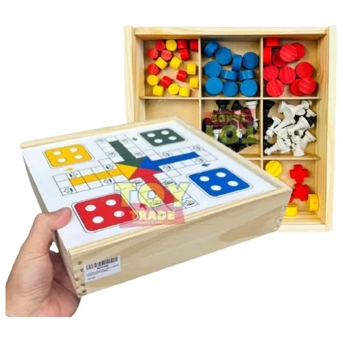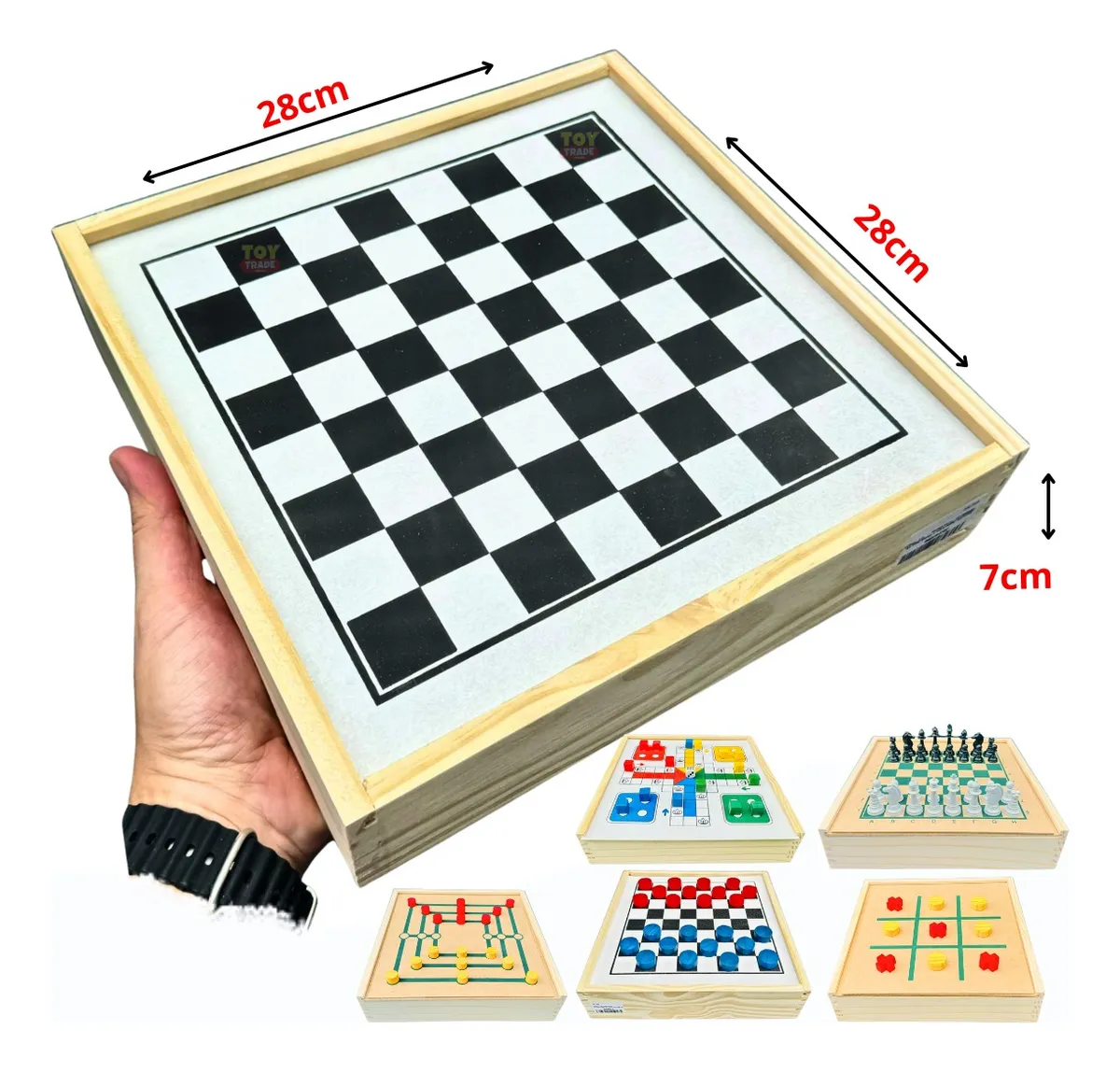 O verdadeiro clássico agora em versão grande, ideal para crianças, jovens e adultos. O Jogo de Mesa 5 em 1 da Toy Trade reúne os jogos mais amados em um único tabuleiro resistente e elegante, confeccionado 100% em madeira de reflorestamento.