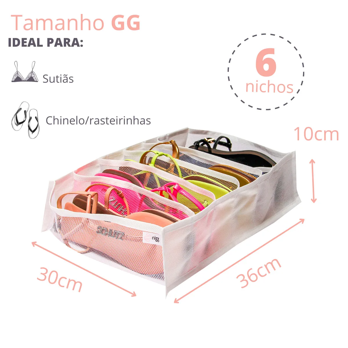 ste organizador de closet da marca NIZZ é perfeito para manter suas gavetas organizadas. Com 6 divisórias e tamanho GG, é ideal para guardar chinelos, rasteirinhas, sutiã e muito mais. Feito com materiais de alta qualidade, suporta até 1000g de peso máximo. Com 30cm de largura e 36cm de comprimento, é compacto e funcional.